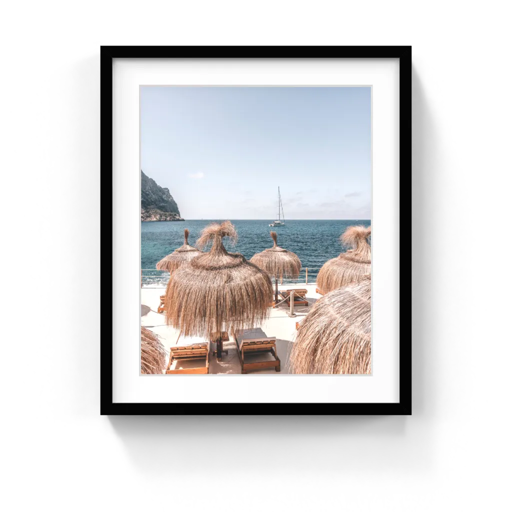 Transport yourself to the shores of Mallorca with this fine art print captured at the iconic Gran Folie beach club. Overlooking the turquoise Balearic Sea, this image features sun-drenched loungers, rustic straw umbrellas, and yachts anchored just offshore—embodying the laid-back luxury of Mediterranean summer. Perfect for coastal interiors, neutral boho decor, or travel-inspired gallery walls, this print adds a warm, breezy touch to any space. Printed on museum-quality archival paper, it brings timeless island elegance into your home.