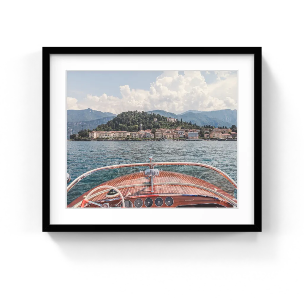 This beautiful print captures the charm of Bellagio as seen from the deck of a classic Riva boat cruising across Lake Como. The rich wooden deck and sleek chrome accents of the boat frame the picturesque town of Bellagio with the stunning Italian Alps in the background. The serene waters and timeless elegance of this scene bring the sophisticated beauty of Lake Como to life, making it a perfect addition to any space.